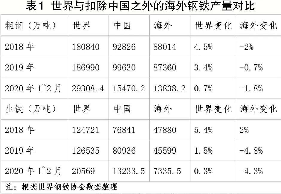 本文擬通過對2019年和2020年前2個月海外的粗鋼和生鐵生產(chǎn)情況、2008年~2009年上一輪金融危機(jī)時海外鋼鐵產(chǎn)量的變化情況進(jìn)行回顧分析,對今年3月~6月份和全年的海外鋼鐵產(chǎn)量及鐵礦石需求減少量進(jìn)行測算。